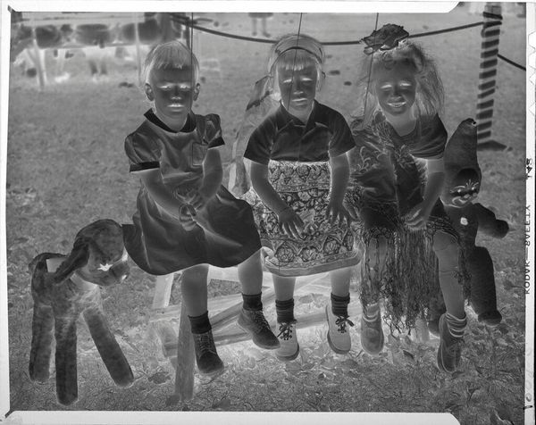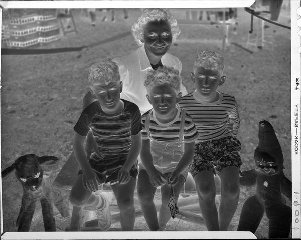 Editor: This photograph, titled "Untitled (three children sitting on ground with balloon)" by John Howell, captures a seemingly candid moment. I’m struck by the inverted tones, which create an ethereal and slightly unsettling feeling. What do you see in this piece? Curator: The high contrast immediately draws the eye, forcing us to consider the relationship between light and shadow as compositional elements. The formal arrangement of the children creates a symmetrical balance, counterpointed by the off-center balloon. Editor: So, it’s the photographic choices themselves that create meaning? Curator: Precisely. The texture of the grain, the tonal range, and the deliberate composition all contribute to the artwork's unique aesthetic and impact, irrespective of the context. Editor: I hadn't considered how much the inverted tones affect my reading of the work. Curator: Indeed. Examining these formal properties enriches our understanding of the photographer's artistic intent.