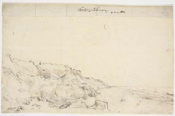Editor: This pencil drawing, “Gezicht op de Salak vanuit Pondok Gedé (?), West-Java," by Adrianus Johannes Bik, dated sometime between 1816 and 1846, is strikingly delicate. There’s almost a ghostly quality to the depiction of the landscape. It feels like a memory fading. What do you see in this piece that I might be missing? Curator: Missing? My dear, you’ve already caught the soul of it! It whispers, doesn’t it? It takes me to Java, long ago, filtered through Bik’s own hazy nostalgia, I imagine. It reminds me of the Dutch Romanticism—this craving for the sublime, found in nature but tempered by the colonial gaze, wouldn't you agree? I find the light absolutely haunting. What do you think the empty sky evokes for you? Editor: I hadn't considered the colonial context so much! I was mostly responding to the misty, almost dreamlike quality, but what you’re saying about Dutch Romanticism is illuminating. That emptiness does now speak to a certain vastness, almost a sense of longing. Curator: Exactly! And those faint pencil strokes—almost like whispers of mountains and foliage. Do you think he's capturing reality as he sees it or is he filtering it through a personal, perhaps idealized, lens? Editor: That’s a great question! I suppose it's impossible to completely separate the artist from their perspective, right? It must be a mixture of both observation and… longing, as you said. Curator: Beautifully put! Every artwork, you know, is a kind of self-portrait. Perhaps even more of the soul of the artist than the object they depict! I’m so glad we shared this experience together, to gaze on Bik's vision of a lost world! Editor: Me too. It’s fascinating how a simple drawing can open up such complex layers of interpretation.