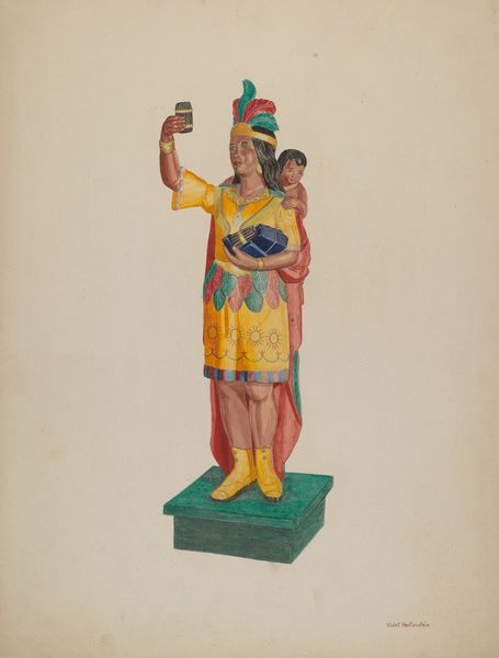 Editor: This is Lucille Chabot’s “Figure of a Girl,” made in 1940 using watercolor on paper. It feels almost like a figurine, carefully painted with distinctive geometric elements across the dress. What do you see in this piece? Curator: The interplay of color and form immediately strikes me. Consider the carefully delineated planes: the ochre jacket contrasting with the muted tones of the dress, the calculated application of pigment to create a sense of depth within a two-dimensional space. What is the effect of these oppositions of color? Editor: It makes her stand out, gives her an almost sculptural presence despite being a flat image. Is it intended to mimic folk art? Curator: Precisely. The application of watercolor in this "Figure of a Girl," demonstrates an attention to materiality, specifically Chabot’s technique in using the paper as more than mere support. The figure is rendered with meticulous detail. The medium’s capacity to produce a flattened, decorative effect becomes her goal. How might this resonate with wider artistic practices? Editor: You're suggesting the method and execution underscore the cultural artifact being replicated… Curator: Indeed! We might consider it in relation to contemporaneous explorations of primitive forms or what others call "folk-art." Look how the brushstrokes almost seem deliberately unsophisticated. Do you feel the use of watercolors contributes to a particular effect? Editor: Definitely. There’s a lightness and delicate quality which adds to its folksy aesthetic, a sense of humbleness. I see the painting is not just an artwork but an exercise in artistic interpretation using formal components of design. Curator: An excellent summary, one that underscores Chabot's masterful use of media to inform the presentation.