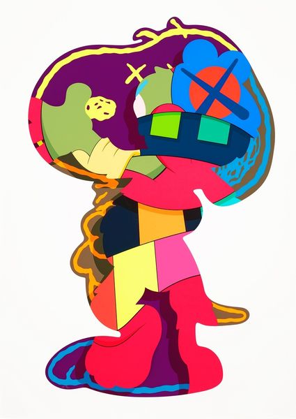 Curator: KAWS, born Brian Donnelly, created this acrylic painting "No One’s Home" in 2015. Editor: It's strikingly disjointed. The bright, almost playful colors clash with the crossed-out eyes, lending a peculiar sense of unease. It's simultaneously inviting and alienating. Curator: Indeed. The composition clearly utilizes Snoopy, Charles Schultz’s famous character, as the primary recognizable visual reference. KAWS takes this image from mass culture and distorts its familiarity through deconstruction. Considering the influence of Pop Art, it is fair to assume KAWS uses commodified cartoon icons and readymade forms, as an explicit commentary of the late capitalist art market, and consumption’s role within culture. Editor: Looking at the formal elements, notice how KAWS simplifies the form of Snoopy to basic shapes. He fragments Snoopy’s figure, reducing the visual representation of the figure, thus deconstructing legibility and coherent form. The flattening of the image plane also directs us to a deeper analysis about cartoon representation itself and, frankly, challenges notions of “high” and “low” art. The "X"s replacing the eyes serve as the artist's trademark, erasing any sense of personality, and instead imbuing this childhood friend with this sense of absence. Curator: This erasure you mentioned becomes a recurring theme within KAWS practice, doesn't it? What about the method of production? These flattened planes of vivid, graphic colors imply techniques tied directly to mechanical reproduction and design processes. Are these paintings the result of factory work? This, for me, prompts questions about authorship. Editor: It's also worth pointing out the smooth application of color—very precise, seemingly machine-made, emphasizing surface over texture. Curator: Overall, KAWS seems invested in reflecting on a sense of cultural loneliness amidst hyper-commodification. What might feel familiar in these forms, in turn, is rendered unfamiliar in its totality of design and art historical influence. Editor: I agree. Its vibrant, flattened form offers an initial allure that slowly unravels into something melancholic, something hollowed out by those "X"ed-out eyes. There's more there, or maybe I should say "less there", than initially meets the eye.