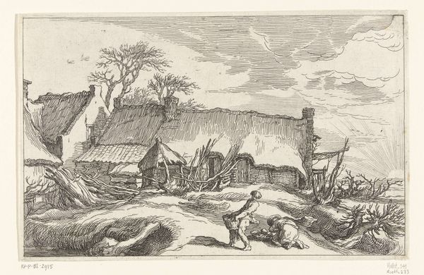 This is "Boerderij met erf," a drawing by Boëtius Adamsz. Bolswert held at the Rijksmuseum. With monochromatic ink, Bolswert creates a detailed rural landscape featuring farm buildings and figures. The texture in this image comes alive through the structured deployment of line. The drawing is dominated by horizontal lines in the sky, which contrast sharply with the vertical hatching used to render the thatched roofs and wooden structures. These directional lines create a visual rhythm, moving the eye across the scene from the clustered buildings on the left to the rounder, organic forms of the trees on the right. The strategic use of light and shadow, achieved through varying densities of line, not only defines the forms but also conveys a sense of depth and atmosphere. Such structured applications of line are essential to understanding the landscape, and reflect a deep engagement with the formal qualities of the medium. Through his art, Bolswert invites us to explore the intricate relationship between representation and abstraction, where the materiality of the line becomes a language in itself.