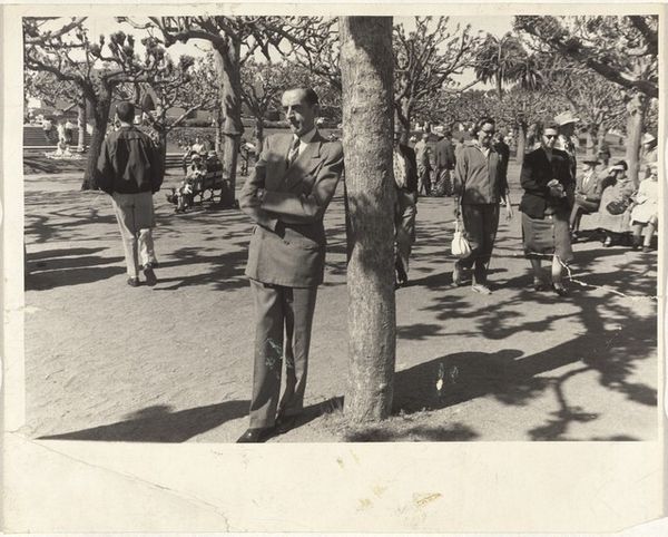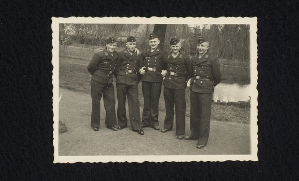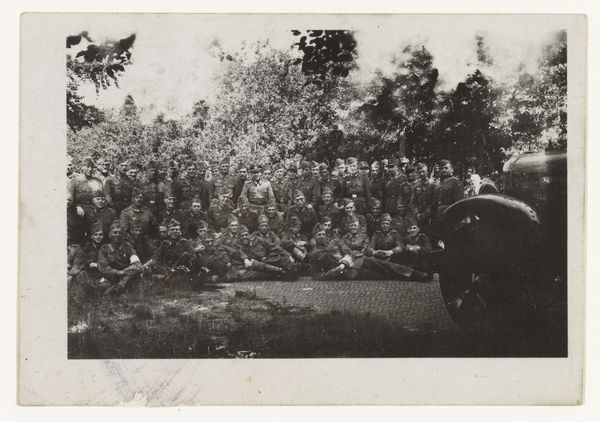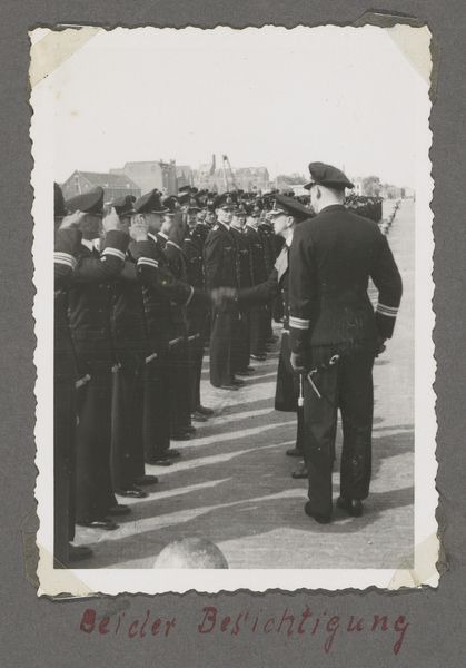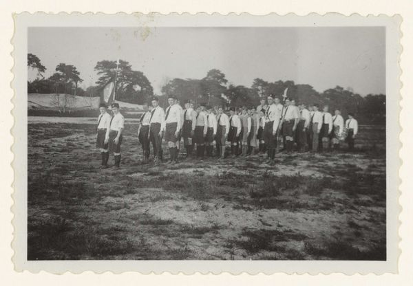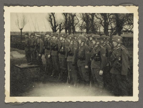 Editor: This photograph, titled "Militairen bij appel", meaning something like "Soldiers on parade", was taken sometime between 1941 and 1945. It's a gelatin silver print held here at the Rijksmuseum. The stark black and white tones and the rows of uniformed figures create quite a rigid, almost oppressive atmosphere for me. How do you see this work functioning visually? Curator: Indeed. Let us first consider the formal elements. Note the photographer's calculated use of perspective. The converging lines draw the eye towards a vanishing point, amplifying the sense of depth and the endlessness of the ranks. Do you observe the textures and tonal gradients at play? Editor: I see what you mean. There's a subtle gradation from the darker foreground to the lighter background that emphasizes the regimented formation, doesn't it? It's almost like a visual metaphor for a kind of dehumanization. Curator: Precisely. Now, consider the play of light and shadow. How does it contribute to the overall composition? Editor: The lighting is fairly even, but there's a contrast between the uniformed figures and the landscape behind, and how it almost fades away. What impact would you say that has on its visual balance? Curator: Note the structural relationships between the forms and the overall spatial dynamics of the image. It suggests order but the background threatens to fall apart behind them. Ultimately, what matters are the purely formal relations in play here, and the tensions produced as they resonate and fail to gel. Editor: I understand. By focusing on composition, we are examining how such formal choices and spatial arrangements create the artwork's primary qualities. Thank you for making me see beyond my immediate reactions to the image and to consider formal analysis. Curator: A crucial exercise. Close looking allows one to grasp an entirely new aesthetic vocabulary and access hidden meanings within works such as this photograph.