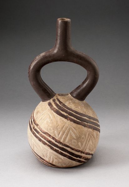 This ceramic vessel in the Art Institute of Chicago was crafted by the Moche people. Note how the artist has stacked bowls to form the vessel's body, complemented by a stirrup spout. The combination of buff and reddish-brown hues gives it an earthy quality. The artist has clearly delineated between the vessel's components, emphasizing each bowl’s distinct shape and contents, and therefore its own individual identity. At the very top, we see peanuts, vegetables, and fruits, and at the bottom, a large, single seed. The repetition of the bowl shape creates a rhythm, yet each level presents a unique texture and tone. The Moche aesthetic here seems to challenge fixed meanings: the vessel not only holds but also represents sustenance. By creating this visual encoding, the Moche artisan offers a complex statement on agriculture, society and symbolic representation. The vessel, therefore, exists as a functional object and a multi-layered cultural symbol.