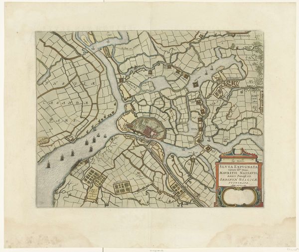 Editor: So, here we have a map titled "Kaart met beleg en verovering van Schenkenschans door Frederik Hendrik, 1635-1636," created by Claes Jansz. Visscher before 1652. It looks like an engraving, almost a pen sketch really, and it details a cityscape during a historical event. It’s incredibly detailed and precise. What exactly am I looking at here, beyond just the lines? Curator: You're looking at far more than just lines. This isn’t simply a map, it's a potent piece of historical representation, carefully designed for public consumption. Consider the context: the Dutch Republic was at war with Spain, fighting for its independence. These meticulously crafted prints weren't just navigational tools. They were instruments of propaganda, celebrating Dutch military successes and shaping public opinion. How do you think this kind of imagery might have impacted people's perception of the war? Editor: Well, I suppose seeing such a detailed, seemingly objective depiction of a siege might make it feel more real, more important. The inclusion of, like, tiny figures of soldiers gives it a sense of action, even if it’s static. It also conveys power and control, I guess, highlighting the Dutch ability to conquer. Curator: Precisely. Visscher isn't just showing *what* happened, but also framing *how* it was perceived. Notice how the landscape is meticulously rendered, almost idealized, turning a brutal conflict into an exercise in skillful execution. Consider, too, where such prints might have been displayed: in wealthy homes, civic buildings… reinforcing a sense of national pride and legitimizing the war effort for elite audiences. But, is it entirely neutral in its depiction? Editor: I'm guessing not. It almost seems to highlight the "order" imposed by the Dutch on what was likely chaotic reality. The precise lines and organization lend an air of authority to the Dutch conquest, almost like they were destined to win. Curator: Exactly! Which highlights how the seemingly simple medium of a printed map becomes a carrier of complex socio-political meaning. Editor: Wow, I hadn’t thought about a map carrying such weight, literally making a political statement. It shifts how I view similar pieces going forward. Curator: Indeed. Art often plays a significant public role and influences our perceptions and understanding of history.