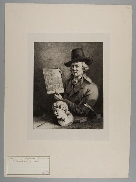 Curator: Here we have Jean Jacques de Boissieu’s self-portrait, aptly titled “Self-Portrait (with Cows)." Editor: It’s moody, isn’t it? All these shades of gray, like a memory half-faded. Curator: It’s an etching, a print, which speaks to the artist's interest in making his work accessible beyond the elite circles. Editor: The cows are a detail within the work he is holding. It feels like he's showing off not just his face, but his entire artistic world. The bust, the drawing, it's all a carefully constructed identity. Curator: Self-representation in art was often a statement of position and intent. Boissieu is placing himself within a lineage of artistic and intellectual tradition. Editor: Maybe, or maybe he just really liked cows. Either way, it’s a glimpse into the artist's mind, or at least the version of himself he wanted us to see.