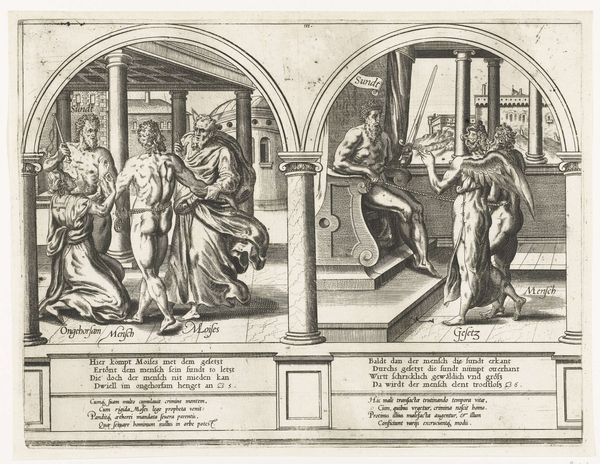 Frans Huys created this engraving, “De gerechtvaardigde Mens op de proef gesteld en de dood van de Mens,” sometime in the mid-16th century. The printmaking process, a skilled practice refined over centuries, allowed for the widespread distribution of images and ideas. It was an early form of mass media. The artist would have used a burin to incise lines into a copper plate, applying ink and then pressing the plate onto paper. The material properties of the metal plate, the ink, and the paper all influence the final appearance of the artwork, resulting in precise lines, tonal variation, and rich textures. The act of engraving itself, a labor-intensive practice, imbues the print with social and cultural significance. By embracing printmaking, Huys bridged the gap between fine art and craft, making his allegorical message accessible to a broader audience. The artwork's themes of faith, mortality, and moral judgment resonate deeply, reflecting the socio-political landscape of his time.