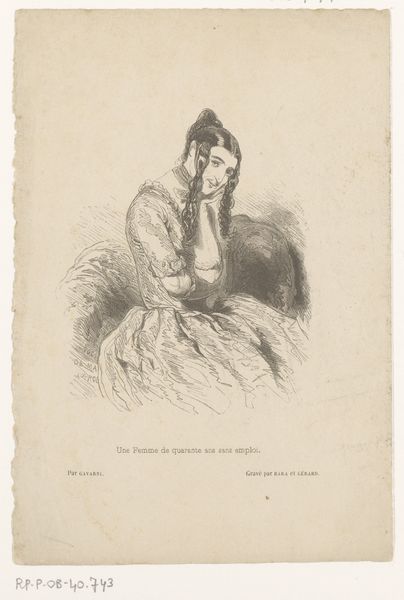 Editor: This lithograph, "Vrouw op een bank denkt na met dolk boven haar hoofd" – Woman on a bench contemplates with a dagger above her head – by Honoré Daumier, made in 1844, has a very unsettling feel. There’s so much tension in the image, amplified by the presence of the dagger. What do you make of this? Curator: Well, look at the title, first. That juxtaposition, that tension, is precisely Daumier's point. He's not simply depicting a woman, but a woman "thinking" with a looming threat, which manifests as the dagger hanging over her head. Note how it floats there in the same field of vision as a romantic landscape. Editor: The contrast is definitely there, between domestic interior and the external threat... So you see the dagger as a psychological symbol? Curator: Precisely! Daggers often function as signifiers of betrayal, violence, or repressed emotions, sometimes even freedom depending on who is holding the blade. What is that woman contemplating that drives her to her wits' end, enough to be haunted by such a symbol? The answer might have its roots in its date: 1844, the year it was made, was fraught with pre-revolution tension. It makes you wonder... are there other cultural touchstones that we might be missing? Editor: So it goes beyond a simple portrait of a woman? Curator: Absolutely. Think about her surroundings, her pose – everything contributes to a story far bigger than just her. Her very dark features stand out; her interior torment threatens to break her apart. What if the title is purposefully reductive in how the woman is the one "thinking," the one generating this "attack," not someone else? Food for thought! Editor: That's a really interesting take. I didn't consider how many layers of meaning a single image could hold. Thanks for opening my eyes. Curator: My pleasure. It’s a rewarding experience to see how historical anxieties can crystallize into potent and haunting images like this.