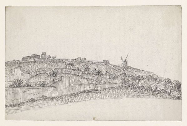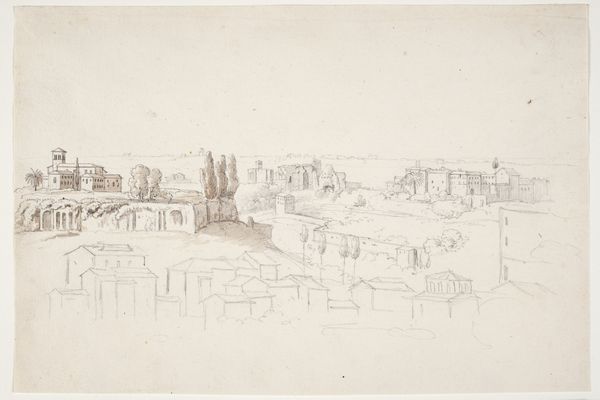 Editor: Here we have Théodore Rousseau's pencil drawing, "Rouaan temidden van heuvels langs de Seine," created sometime between 1822 and 1867. It's such a delicate and almost dreamlike rendering of a city. What draws your eye when you look at this piece? Curator: I'm struck by how Rousseau positions the city, specifically Rouen, within a grand, sweeping landscape. He’s less interested, I think, in the specifics of architectural detail and more in the city’s relationship to the natural world. How does situating Rouen “among the hills along the Seine” affect our perception of the urban space? Editor: It feels almost…vulnerable? Like civilization is just a small part of a much larger system. Is that something artists were exploring during this period? Curator: Absolutely. The 19th century saw rapid industrialization and urbanization, and artists often responded by either celebrating progress or lamenting what was being lost. Rousseau, aligned with the Barbizon school, was firmly in the latter camp. They actively chose rural subjects, highlighting a disappearing way of life. Can you see that in the level of detail he applies to the foliage in the foreground compared to the more generalized depiction of Rouen itself? Editor: I do now! So the looseness of the city’s rendering is actually intentional, emphasizing the enduring quality of the landscape. Curator: Exactly! The pencil sketch aesthetic further emphasizes this ephemerality. How might contemporary audiences have viewed an artwork so invested in this kind of nostalgia? It served as both a reminder of what was being lost and, perhaps, a call to reconsider the relentless march of progress. Editor: That’s fascinating. I always saw these landscapes as just pretty scenes, but understanding the social context gives them so much more depth. Curator: Precisely! Considering art within its historical context helps us unlock its deeper meanings and understand its role in shaping cultural attitudes.