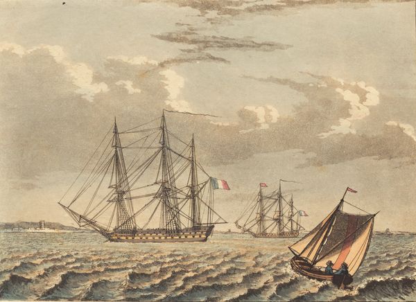 Curator: Take a look at William James Bennett’s "View of the New York Quarantine, Staten Island," possibly from 1833. The scene, rendered in watercolor, captures the bustling harbor. It's full of tall ships, smaller boats, and what seems like a shoreline crowded with buildings. What do you make of it at first glance? Editor: A liminal space, definitely. The light and sky give it a feeling of impermanence, like a dream half-remembered, all floating on that somewhat choppy water. Curator: It certainly evokes a specific mood, a sense of anticipation perhaps. What interests me are the tangible implications: the ships aren't just picturesque; they're part of a network. Quarantine represented both a physical place and an attempt to control flows of people, disease, and, by extension, commerce. Look at the materiality of that print, each line carefully etched, mimicking the precision needed for public health infrastructure. Editor: You’re right. Think of the labor it represents—the making of paper, inks, the etching, the printing…all so tied up in the movement the quarantine sought to regulate. I’m caught between the romanticism of those Hudson River School painters and the practical, often brutal realities it evokes. Curator: I see that contradiction, too. These paintings from the Hudson River School idealize and emphasize the power and importance of landscape, however, they also capture the raw material and natural settings that facilitate work—the literal lifeblood of the country, and the place of a sometimes crude social exchange. Editor: Perhaps there's an inescapable melancholy here. We’re peering into the past, into the very foundations of our relationship with materials and landscape, but also grappling with isolation, anxiety, and a past world struggling with a new era, something eerily resonant today, don’t you think? Curator: I couldn't agree more. This image encourages us to see beauty not in spite of but together with utility and history. Editor: Yes, it's about layers—of paint, of meaning, and, perhaps most importantly, of lived experience that the water reflects in many directions at once.