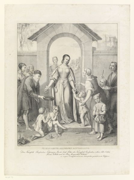 Eugen Eduard Schäffer created this print, "The Introduction of the Arts in Germany by Christianity," in the nineteenth century. Notice the linear precision, typical of engraving, that defines forms and textures across the composition. The scene is organized around a central figure, presumably a Christian figure, acting as a bridge between two groups, suggesting an encounter between classical tradition and Christian influence. Observe how Schäffer uses the landscape setting, with carefully placed trees and architectural elements, to frame the narrative. Linear patterns created through engraving techniques not only describe the characters' clothing and features but also suggest a symbolic layering of historical and cultural identities. The border decoration, adorned with classical motifs, suggests an attempt to harmonize pagan and Christian themes. Consider how the formal aspects of this work invite us to consider the role of art as a medium for cultural exchange and religious transmission. The artist uses precise engraving to create an allegorical representation of cultural transformation, inviting questions about the relationship between art, religion, and national identity.