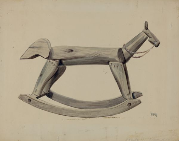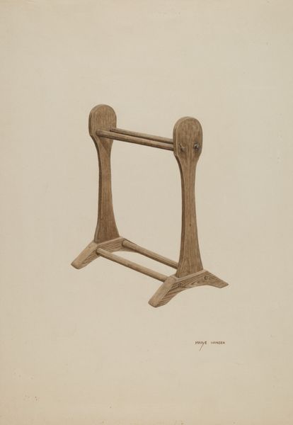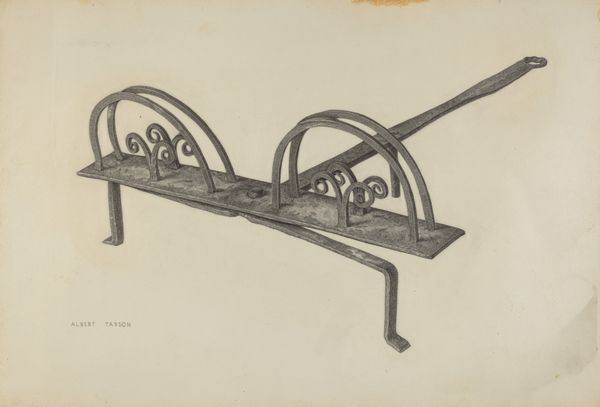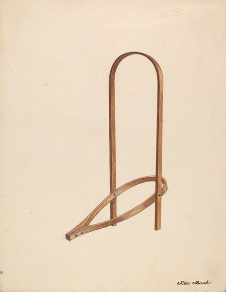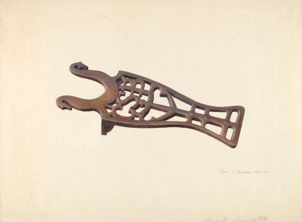 This "Flat Iron Holder" was made by John Swientochowski; I wonder if it's watercolor and ink? I really appreciate that the artist chose to depict this utilitarian object with such care and attention. The earthy palette gives it a quiet presence, like it's been sitting in someone's attic for decades. You can almost feel the texture of the aged metal, a roughness that contrasts with the soft, delicate washes of the paint. If you zoom in, you can see how the artist let the watercolor pool in certain areas, creating these subtle gradations of light and shadow. And that little loop at the end of the handle? It's like a tiny punctuation mark, adding a touch of whimsy to the whole composition. The piece reminds me a bit of Giorgio Morandi's still lifes, just in its humble subject matter and the way it finds beauty in the everyday.