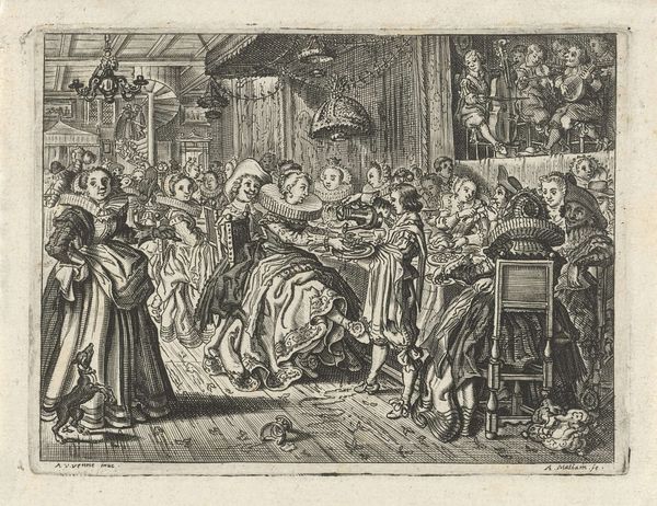 Cornelis van Kittensteyn’s small engraving, "Dancing Company in an Inn," presents a lively scene rendered with delicate intricacy. The composition is dense, filled with figures engaged in various revelries, all unified by the dance at the center. The texture created by the fine lines of the engraving lends a sense of bustling energy to the scene. The spatial organization invites a structuralist reading. The foreground presents the immediate action, while the background offers glimpses into other, perhaps less innocent, activities. This division creates a semiotic system, where each space signifies different aspects of social behavior. The contrast isn't just visual; it challenges conventional notions of decorum. Consider, too, the artist's play with scale. The diminutive size of the print intensifies the experience, drawing the viewer into a voyeuristic engagement with the depicted chaos. This invites us to decode the underlying structures of the artwork. The engraving, with its ordered lines portraying disorder, highlights the paradoxical relationship between form and content, suggesting that even in revelry, there is a structure, a system, at play.