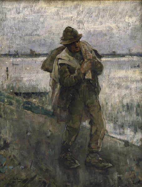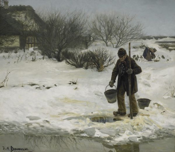 Curator: Standing before us is Jacek Malczewski's oil on canvas, "Portrait of Adolf Dygasiński with birds", completed in 1905. Editor: It's intensely wintry, almost monochromatic, save for the ruddy beard and the life teeming on the ground around the figure. There's a kind of desolate beauty to it. Curator: Malczewski, deeply embedded in the Symbolist movement, often explored the artist's role in society. Dygasiński was a naturalist writer and educator; one might consider this artwork in light of Poland's intellectual landscape in the early 20th century. Editor: Absolutely, and these birds immediately capture my attention. Look at them – they're like little souls fluttering around his feet. Is he feeding them, or is it something more symbolic? Perhaps related to freedom or a connection to nature which would have had specific relevance to Poland’s historical position at the time? Curator: That connection to nature is crucial, I believe. Dygasiński’s own literary work frequently highlighted the dignity and suffering of animals in a rapidly industrializing world. The portrayal here acts, then, as a public statement by Malczewski about Dygasiński's philosophy. Editor: There’s a stoicism in the man’s face that strikes me. He's planted firmly on this cold ground and yet there is this burst of avian vitality. It's as if the weight of existence is softened by this connection to something wild and free. And his beard; an interesting life-affirming red-gold counterpoint against the blue coldness of the surrounding snow. Curator: Indeed, Malczewski often utilized portraits to celebrate individuals actively engaged in shaping cultural discourse. The placement of Dygasiński amongst this throng of birds speaks to the author’s empathetic worldview. Editor: This image really invites one to consider the role of humanity within nature, and that interplay is what stays with me most profoundly. It feels like more than a portrait; it is a poignant observation about humanity's bond with the world around us. Curator: It’s a powerful work that demonstrates how a portrait can extend beyond individual representation to embrace broader societal concerns.