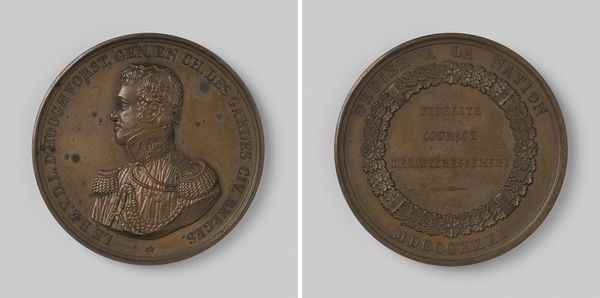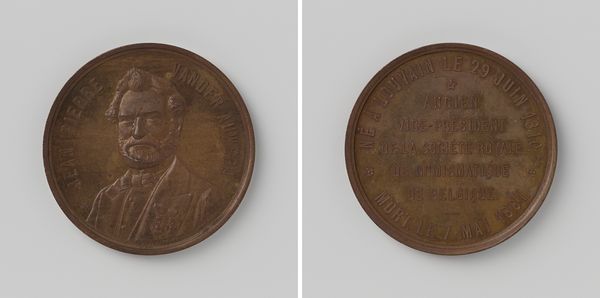 Salomon de Vries created this bronze commemorative medal in 1872 to mark the death of Johan Rudolph Thorbecke. De Vries employed a striking process here: die-striking, a technique often used for coins and medals, where a design is impressed into metal using hardened steel dies. Bronze, with its reddish-brown hue, was commonly used for commemorative objects, lending a sense of permanence and solemnity. But the sharp, precise details achieved through die-striking elevate this from a simple cast object. Look closely, and you will see the crisp portrait of Thorbecke and the fine lettering listing significant dates in his life. This process also implies a certain level of mechanization and repetition, a reflection of the industrial age in which it was made. The medal wasn't individually sculpted, but rather produced through a repeatable process, making it accessible to a wider audience. It is a reminder that even commemorative art is often bound up with the means of production, labor, and wider distribution.