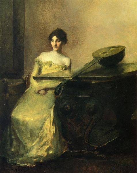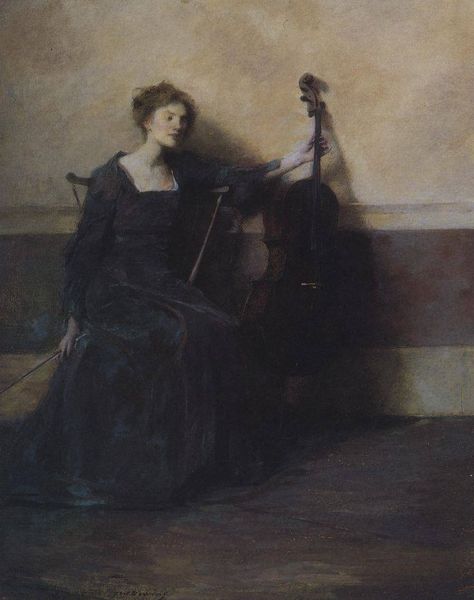 Thomas Wilmer Dewing created this painting, titled "The Musician," during the late 19th century, a period when rapid industrialization and urbanization were transforming American society. Dewing, aligned with the Aesthetic Movement, sought refuge in beauty and idealized representations of women. In this composition, a woman is portrayed in quiet repose alongside her cello. Her identity as a musician intertwines with prevailing notions of femininity at the time. While the cello represents artistic skill, the woman's graceful pose and delicate features also conform to societal expectations of women as objects of beauty and refinement. This piece invites us to consider the complex interplay between gender, artistic expression, and social roles. Dewing seems to ask, what does it mean for a woman to be both an artist and a subject of aesthetic contemplation? "The Musician" isn't just a portrait; it's a reflection on the cultural values and gender dynamics of its era, inviting us to reflect on the emotional and societal dimensions of artistic identity.