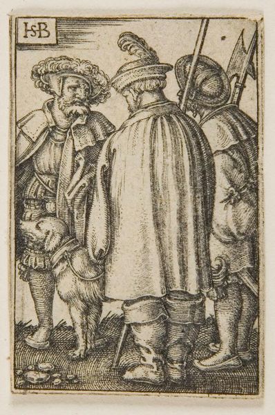 Editor: This etching, “Three Soldiers with a Dog” by Sebald Beham, from somewhere between 1510 and 1550, depicts, well, three soldiers and a dog. It’s really detailed, almost like a carefully rendered sketch. How do you interpret this work, considering the historical context? Curator: What strikes me is how it presents a vision of military life. Not the glorious battle scene we often see, but a glimpse into the everyday. Soldiers at ease, accompanied by a dog – likely a working animal or even a companion. It hints at the socio-political role these figures played within the community and raises questions about the printing press shaping early European views about conflict. Does this piece reinforce or challenge your preconceived notions? Editor: I guess I hadn’t really thought about soldiers having down time like this back then. It feels a bit more human than, say, a portrait of a triumphant general. The presence of the dog is especially grounding. Curator: Exactly. These images, circulated widely, could be instrumental in constructing or challenging power structures, portraying a narrative for public consumption. Consider how this seemingly simple image reflects upon a rising sentiment towards the military during this period, subtly legitimizing and portraying its impact and acceptance to the populace. It almost humanizes war... What does it make you wonder? Editor: I’m curious if the inclusion of the dog could be related to loyalty to their commander. Curator: Precisely. Its inclusion and symbolism definitely enrich this work. I suppose it speaks volumes on the image's subtle function as a mode for spreading specific messages through society. It encourages questions of obedience, valor, duty, which leads us back to consider its overall political aim in history. Editor: This has helped me consider this piece as less a slice-of-life image, but something with more power behind it than I initially considered. Curator: And for me it is another step towards unravelling its meaning, reflecting the power structures of that time through art's complex relationship with society.