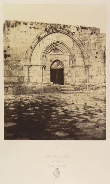 Editor: This is "Jérusalem, Fontaine Arabe, 2" by Auguste Salzmann, taken sometime between 1854 and 1859. It's a photograph of a stone fountain, presented in monochrome. The high contrast and geometric forms create such a strong sense of depth. How do you interpret this work formally? Curator: Formally, it's a fascinating study in contrasts, isn’t it? The interplay between the solid, almost severe geometry of the fountain structure, versus the softer, organic forms suggested by the crumbling stone and the interplay of light and shadow across the cobblestones. Note how the photographer uses the archway as a framing device, but fails to actually frame much sky, pressing the viewer in on the image, limiting its possibilities. Do you notice the subtle shifts in texture? Editor: Yes, the rough texture of the stone is quite striking against the smoother areas, especially within the arch itself. It almost feels tactile, like you could reach out and touch the photograph and feel the roughness of the stone. What is the purpose of this? Curator: Precisely! The textural contrast heightens the sense of depth and invites a tactile engagement. Note the carefully balanced composition. The strong horizontal lines, such as at the base of the fountain and then the top, intersect with the more fluid lines of the arch. In a sense the image does little to pull the eye from foreground to background, further flattening out any real chance for the eye to settle, and further enforcing an unsettling atmosphere. Is there a resolution or even harmony here? It challenges the viewer. Editor: That’s an interesting point, I see the dissonance more clearly now. So it's not just about representing the fountain realistically but also about the photographer using the image and these structures to challenge our perspective. Curator: Indeed. Through carefully orchestrating form and texture, Salzmann delivers a work that transcends mere documentation, delving into something quite sublime. Editor: I hadn’t considered that angle. I’ll definitely look at the composition with fresh eyes. Curator: And I appreciate you pointing out the texture of the stone—a key element easy to overlook.
