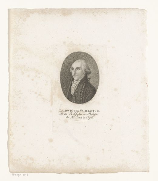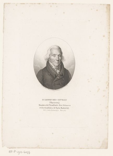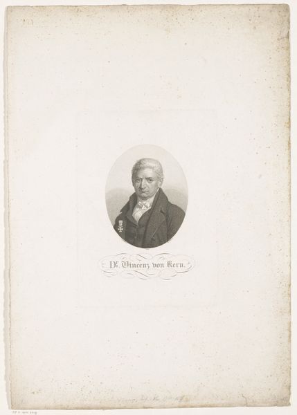 Editor: This is "Portret van Ludwig Wilhelm Gilbert" created sometime between 1824 and 1836 by Johann Friedrich Bolt, an engraving, housed in the Rijksmuseum. There is something very reserved about this man. How do you interpret this work? Curator: Well, the figure is presented within an oval frame, a traditional form that itself evokes ideas of classicism, and perhaps eternity. Note how the lines of the engraving are not just descriptive, but psychological. Editor: Psychological? How so? Curator: The sitter's gaze meets ours directly. What does it communicate? This direct address creates a connection, yet the man is carefully, even rigidly, presented. It hints at an age of reason emphasizing intellect, control. Also, consider the symbolism of prints at the time. Editor: That it could be mass produced? Curator: Exactly! Portraits immortalized the sitter. Being in a museum now is a sign this person made a significant contribution, to become, in some way, immortalized. Editor: I see! So the visual language and the medium reinforce a lasting legacy. Thanks for sharing! Curator: My pleasure! Examining these portraits reminds us that cultural memory lives within symbols.