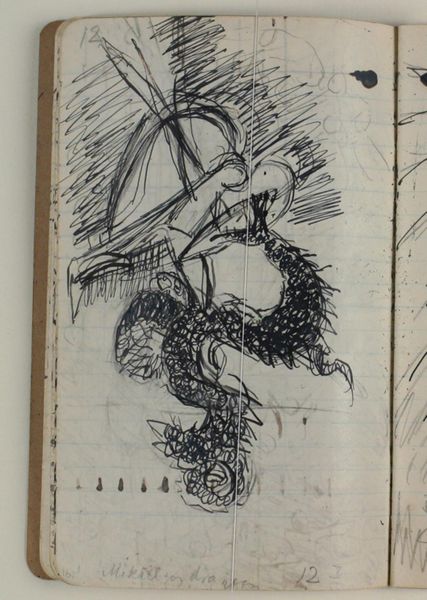 Curator: It's captivating how raw this feels. So immediate. Editor: Indeed. What we have here is a pen and ink drawing by Niels Larsen Stevns, made between 1933 and 1934. It's titled "Archangel Michael's fight with the dragon." Curator: I'm interested in the materials chosen. Pen and ink. Simple, accessible, economical. It suggests a sense of urgency or perhaps an intention not to monumentalize, but rather, to explore an idea. Was this a study, a sketch for a larger piece maybe? The sketch itself feels very abstract, especially how Stevns renders the dragon, using simple shapes, hatching and circular strokes, and the marks around it, that seems a chaotic maelstrom around a very centralized form. Editor: Well, Stevns was working within a period heavily shaped by theological debate and emerging psychological theories, it's compelling to consider that perhaps that is what’s going on here and how this abstraction reflects the struggle between faith, doubt, reason and madness. Public discourse at this time was extremely concerned about religion and this struggle for a strong identity as an individual. His personal experiences and societal forces undoubtedly influenced the selection of this imagery. Curator: Precisely! The scale invites intimate engagement. Look at how the marks accumulate, building this furious form of darkness below the Archangel's simplified, yet assertive lines of form. And what does it mean when such powerful themes become translated into basic forms for visual representation? It pushes our consideration toward the processes of representing a powerful idea. Editor: Yes. It brings this ancient theme into dialogue with Modernism and inter-war anxieties, as well. Stevns was creating works that speak to social changes, but also to how public interest around religion was expressed during his own time. He's almost grappling with how traditional iconography operates. It reflects Stevns' own socio-political surroundings during a difficult period in Danish history. Curator: Ultimately, Stevns prompts us to look at not just the symbols, but also at the conditions of mark-making itself. Editor: Right. It is clear he invites a crucial consideration of not only socio-political contexts of artwork production, but also of its reception in both modern and future viewing audiences.