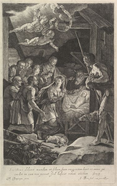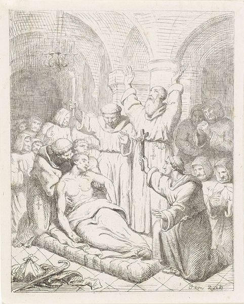 Curator: Right, let’s focus on this moving scene. This engraving, “The Entombment of Christ,” was created around 1618 by Nicolaes de Bruyn. It’s part of the Rijksmuseum’s collection. Editor: Gosh, it hits you right in the gut, doesn't it? That pale, limp body. It's so stark. And everyone around, draped in grief. I feel almost like I'm intruding on something sacred and profoundly sad. Curator: The scene is set with meticulous detail typical of the baroque style, even though Bruyn was working slightly outside its peak. We see Christ being lowered into his tomb, surrounded by mourners, and a landscape extending behind them, up the hillside. It invites contemplation, but consider the role of prints like this; they democratized religious imagery. Editor: Yes, the landscape almost seems to swallow them up—nature indifferent to their sorrow. It makes you think about how faith sustains in the face of cosmic silence. Although indifferent, it really lends itself to the emotional aspect. What does it mean when grief is at the forefront? I bet in its time, this piece felt both personal and political! Curator: Exactly. Prints made the imagery more accessible, influencing public devotion and religious thought beyond the church. And it does point to history painting, to narration in general, and beyond religion. Note also that in the original time, engraving was considered a meticulous practice, one of skilled artisans rather than artistic visionaries. It certainly influenced popular culture through its availability and aesthetic style. Editor: True! The etching feels so meticulous, every tiny line adding to the drama. Thinking of its popularity then – these stark images made profound statements beyond aesthetics alone, shaping perspectives and, in effect, faith itself. It definitely speaks of the power of imagery, its reach in people's lives, doesn't it? I do love that it gives me such emotional reactions, no matter its historical background. Curator: Indeed, it illustrates the powerful connection between art, religion, and public life in the early 17th century. The work is so impressive because it achieves these large goals and scale at such a low format, allowing the people to access such intense imagery. Editor: Thanks, I’ll remember it's more than simply an emotional landscape but a powerful tool of thought and belief.