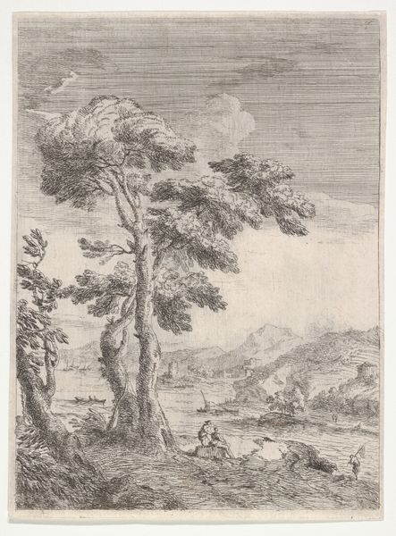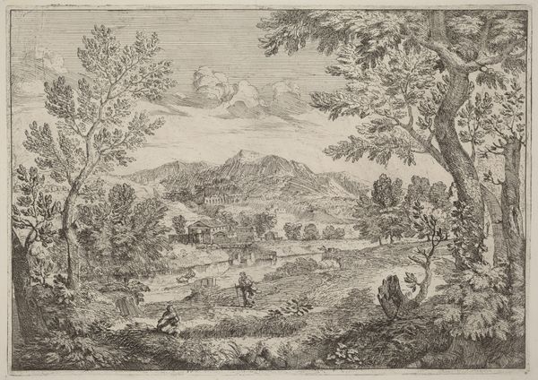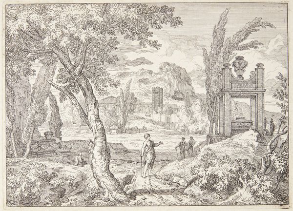Curator: Henri Mauperché’s, The Angel Advises Tobie, a print created sometime between 1625 and 1685, currently held at the Metropolitan Museum of Art, offers a glimpse into a narrative scene set within a serene landscape. What's your initial response to the visual composition? Editor: There's a stark contrast between the delicacy of the rendering and the apparent monumentality it depicts. The ethereal lightness achieved with what looks like pen and ink, combined with watercolor washes on what looks like toned paper, seems at odds with the weighty subjects, creating a slightly unsettling yet intriguing mood. It feels almost alchemical. Curator: Precisely! Notice how the medium, likely printmaking judging by the clear lines, enhances the landscape's delicate interplay between light and shadow. The architectural elements, like the fluted columns, juxtapose sharply with the organic forms of the trees, creating a dynamic tension within the composition. Editor: Absolutely, that juxtaposition speaks volumes about the period's changing sensibilities, but I'm especially drawn to the material process itself. What sort of labor and workshops went into preparing the printing plates and inks? Was the tonal paper made with specialized fiber that lent the scene luminosity, almost as if backlit from within? These questions really add a layer of appreciation to this work beyond mere pictorial representation. Curator: Well, the medium enables distribution, of course, and it is certainly designed to communicate an allegorical and moral narrative; we see Tobie receiving guidance, a classic example of divine intervention visualized through calculated compositional arrangements. It conforms neatly to established representational practices and symbolic frameworks. Editor: True, but let's consider the tangible impact, too. Were these prints intended for devotional spaces, to enhance spiritual experience, or for more secular appreciation among the educated class? How accessible were the raw materials and processes of creating such pieces? Curator: Regardless of original context, the enduring appeal of "The Angel Advises Tobie" lies in its structural balance. Note how Mauperché directs our eye through a skillful deployment of contrasting shapes, tones and precise lines of a classical form which leads to symbolic gestures. The linear articulation, which adheres perfectly to baroque landscape styles, lends an atmospheric sensibility. Editor: Fair enough, the art’s composition is beautifully laid out, and my materialist gaze only hopes to deepen that appreciation, not detract from it, by contextualizing it within the actual making of its time. The value for me lies equally within the hand that made it as well as in what the finished piece displays. Curator: A fruitful examination, indeed. Editor: I agree, there's always more to learn from art with multiple interpretive frames.