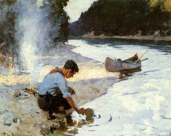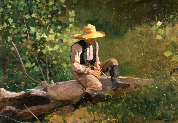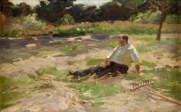 Editor: Here we have John Singer Sargent’s "Val d’Aosta, A Man Fishing," circa 1907, rendered in oil paint. I'm struck by the textured brushwork, the way the sunlight seems to dance on the water. What specific compositional elements draw your eye in this piece? Curator: Primarily, it's the structural relationship between the human form and the landscape that commands attention. The fisherman, almost recumbent, acts as a horizontal anchor against the verticality implied by the trees and reflected in the fishing pole. The formal juxtaposition here serves not only to highlight the figure, but to integrate the body into the landscape, yes? Editor: Yes, it really nestles him into the scene. Can you elaborate on the function of color within this composition? Curator: Consider the chromatic range – predominantly earthy yellows and greens – against the fragmented purples and blues of the water. These color choices, while seemingly realistic, act as signifiers of light and depth. They construct space within the two-dimensional plane. Ask yourself: what would change about our interpretation of this painting if Sargent used, for instance, more blues? Oranges? How would this adjustment challenge our current formal read? Editor: That’s interesting to consider. It could almost invert it and turn it into a cooler and still-life-esque tableau. How does Sargent’s technique contribute to the overall meaning of the artwork? Curator: Notice the brushstrokes, broken and impressionistic, they operate not merely as representational tools but as active agents in shaping visual perception. These are autonomous marks and formal considerations, divorced from strict mimetic concerns. They suggest movement and ephemerality, echoing the fleeting nature of light and time. Don't you think the artist achieves this beautifully? Editor: I completely agree. Thank you for shedding light on the artwork’s intrinsic qualities, seeing them divorced from their surroundings like this creates another layer of appreciation. Curator: My pleasure; analyzing form brings renewed perspectives, wouldn’t you say?