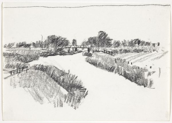 Curator: Kees Stoop gifted us with this small graphite drawing, a landscape simply titled “Landschap met bomen," which translates to "Landscape with Trees." Though its creation date is broad, spanning from 1939 to 2009, its modest size makes it feel like a quick observation. What do you think when you first see it? Editor: Quietude. I’m struck by the simplicity, but not in a minimalist way. It’s more that everything feels hushed, like holding your breath in a snowy field. It's more gestural than hyper-detailed, and because it's so softly rendered in graphite, it’s very unassuming. Almost disappears into the white of the paper. Curator: Absolutely. The realism, or what feels realistic to our eyes, is actually created by these layers and almost chaotic lines—there is little solid mark-making. The artist captures form and shape via line and contrast, not solid masses. It gives the entire scene a type of "aliveness." Editor: You're right. The frenetic mark-making gives it this shimmering effect, as if the air itself is moving. Stoop worked during and after the Second World War; given the period during which this artwork could have been made, do you see reflections of that history in what you term this 'aliveness', in the almost anxious energy of the lines? Curator: It’s tempting to read anxiety into it, especially knowing Stoop's biography. The landscape genre is always about what is present or what is lost. In our contemporary moment, as in Stoop’s life, there is much lost, perhaps especially to our own future, in the state of the natural world. Stoop had returned to landscape during wartime as solace. Perhaps that peace is not represented perfectly in its visual construction; even in graphite there is the energy to push back on devastation and loss. Editor: The drawing feels almost like a memory, indistinct yet deeply felt. Thanks for pointing that out, it really is a subtle meditation. Curator: My pleasure! And now it is back to our future with our viewers. Thank you for adding further perspectives.