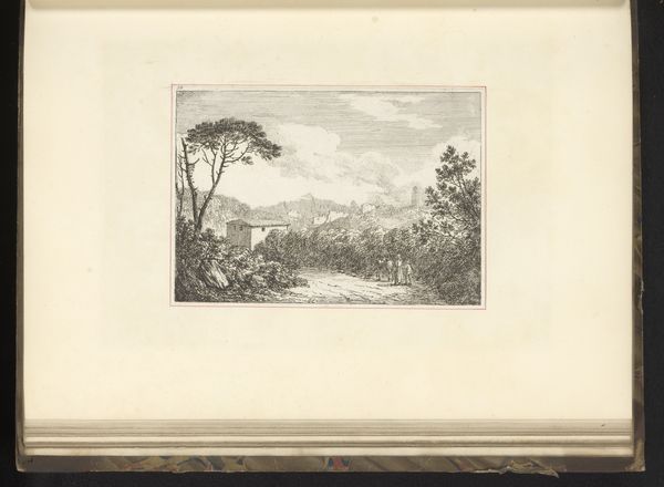 Edward Edwards created this landscape with wanderers using etching techniques. Notice how Edwards structures the image. A cluster of trees dominates the right foreground, balanced by a single tree on the left, creating a sense of depth and perspective that draws the eye into the scene. The figures, seemingly pausing on their journey, are positioned at a key intersection, their placement guiding our gaze along the winding path. Edwards uses light and shadow to define form, giving texture to the foliage and suggesting the contours of the land. The church in the distance, a classic symbol, adds a layer of cultural meaning, perhaps referencing the spiritual dimension of the natural world. Edwards masterfully invites us to consider how we, like the figures, move through and perceive our environment, imbuing a sense of wonder and contemplation.