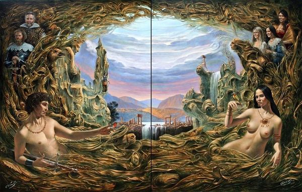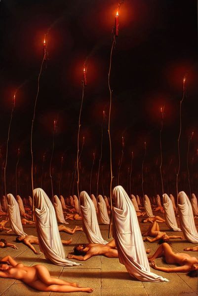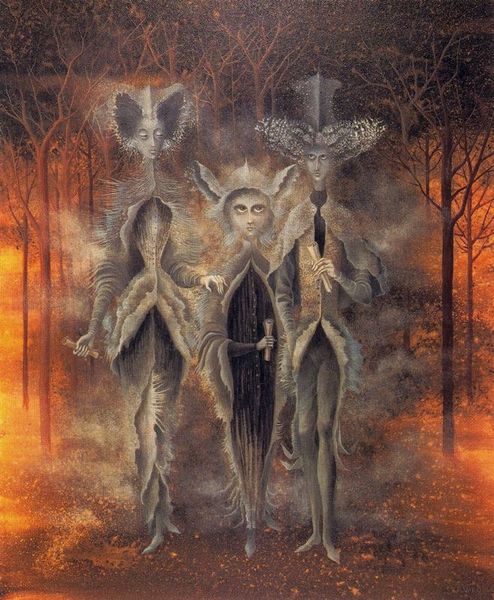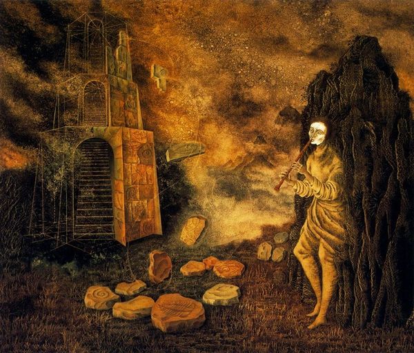 Remedios Varo's painting presents us with a scene steeped in potent symbolism. Figures cloaked in robes gather around a fire, while a peculiar structure looms in the background, supported by cloaked figures. The robed figures, reminiscent of monastic orders or perhaps spectral entities, immediately call to mind the cyclical nature of human rituals. Consider, if you will, the symbol of the circle— a form of cyclical return present in primitive rituals, such as a coven. Similarly, the bonfire evokes ancient rites, a focal point for community and transformation, yet the facelessness of the figures suggests anonymity and a loss of individual identity within the group. And, looming in the background: what is that construction? Notice the pair of eyes. Eyes are powerful symbols for those that gaze upon us and their gaze is a reminder of our own morality. In this dreamlike composition, the eyes convey a psychological depth, creating an eerie, engaging experience. Ultimately, Varo's work reminds us that symbols never truly die; they merely transform.