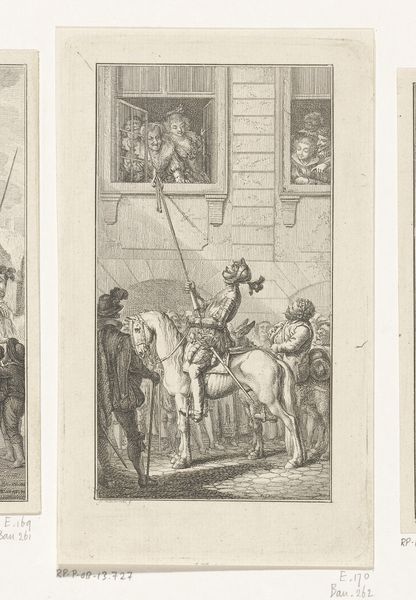 Curator: Ah, yes. "Hudibras Triumphant," Plate 4 from the series Twelve Large Illustrations for Samuel Butler's Hudibras by William Hogarth, etched sometime between 1725 and 1726. Look at this feast of detail! What catches your eye first? Editor: What strikes me first is the...controlled chaos. It's like a stage crowded with actors, each with their own mini-drama playing out, and yet the composition somehow manages not to collapse under its own weight. And there is definite humor! Curator: Hogarth always knew how to tell a story. The work, a print, shows the protagonist of Samuel Butler's satire "Hudibras" in a moment of perceived triumph, I believe. Though perhaps, like a carnival mirror, the triumph is skewed and ironic. Editor: I'm fascinated by that central figure on the horse. Is he supposed to represent idealized chivalry? Because, visually, his stature suggests something more pathetic than glorious, it’s hard to read as truly heroic. He almost seems to be bowing from horseback. Curator: Exactly! It's Hogarth skewering pretense. Think about the symbolism – the horse, usually an emblem of power and nobility, is rather...ordinary. The stocks nearby, the crowd with the rather severe dress—it all points to a society caught between traditions and new ideas. Editor: And the guy with the peg leg is he also being subjected to the “triumph?" He's got that defeated stance, almost like he’s surrendering to the victor and facing his humiliation. What story does *he* represent, do you think? Is he a vanquished foe, or another kind of social commentary? Curator: The beauty of Hogarth is that there's rarely one simple answer. He captures the contradictions of his era, making this more than just historical fiction; this really speaks to something bigger. Perhaps this engraving acts as a window, with him showing humanity, warts and all. He leaves enough unsaid for you to make it your own. Editor: That makes the experience feel alive. Art like this should leave us pondering. It’s also making me rethink the very idea of triumph. What *does* it mean, and who decides who’s in charge, anyway? It makes me question so many social norms. I guess the mark of really great work, or the iconographic work, in this case, is if it shakes you out of your expectations! Curator: Precisely. That's Hogarth for you, always prodding beneath the surface. He dares you to question everything!