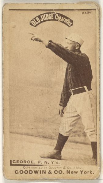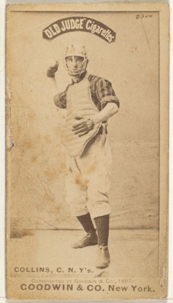Editor: Here we have an albumen print from 1887 featuring James Henry O'Rourke, a third baseman for the New York team. It's part of the "Old Judge" series. I find the sepia tones and the small size quite intimate, but it’s also a bit odd seeing a baseball player used to sell cigarettes. What layers do you see at play here? Curator: It's critical to consider the confluence of commerce, sport, and identity construction. Think about how images like these circulated. They weren't just promoting cigarettes; they were crafting narratives around masculinity, athleticism, and American ideals. These "Old Judge" cards placed athletes on the same plane as actors, politicians and other public figures, implicitly shaping our perception of heroism and role models, often reinforcing the social hierarchies of the time. Editor: So, it's not just a baseball card, but a tool for shaping social perceptions? Curator: Exactly. And who was included, and excluded, from these narratives matters. This photograph also reflects how sports were becoming increasingly professionalized and commercialized. Ask yourself how the promotion of tobacco, closely associated with ideas of rugged masculinity, played a part in reinforcing certain gender norms. Whose version of ‘masculinity’ does this idealized version of an athlete bolster and what are the historical effects? Editor: It's interesting to consider how an image initially seen as simple advertisement is steeped in social meaning and messaging about power. Curator: Right! This single image can launch us into examining ideas of gender, labor, and capitalism in late 19th-century America. It prompts us to reflect on how similar image economies shape our own cultural landscape.