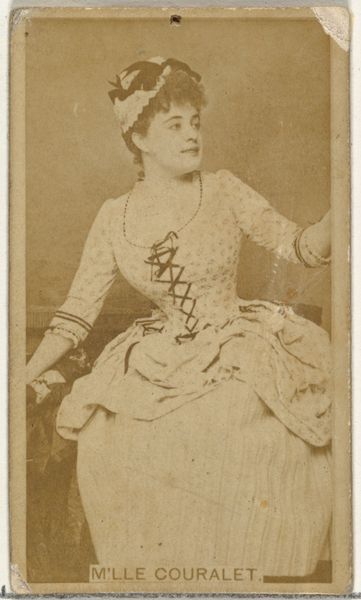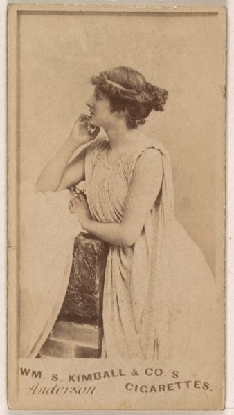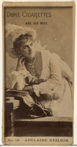 This small card, featuring Jennie Prince, was produced by Allen & Ginter for Virginia Brights Cigarettes. The sepia tone and compact format encourage an intimate viewing experience. Prince is depicted leaning pensively, creating a diagonal composition. The soft gradations of tone give form to the textures of her clothing and the ornate fabric beneath her arm. Let's consider this image through the lens of structuralism. The card presents a series of signs: the actress, the cigarette brand, and the aesthetic style, each carrying cultural meanings. It transforms Jennie Prince into a commodity, simultaneously promoting her image and the cigarettes. The composition invites a reading of her persona, constructed through pose and costume. Ultimately, the card functions as a sign within a larger system of advertising and cultural representation. It reflects an era where celebrity and commerce were becoming inextricably linked. The image is a testament to the power of visual media in shaping perceptions and desires. It is an intricate interplay of commerce, celebrity, and visual culture.