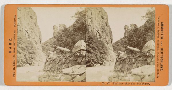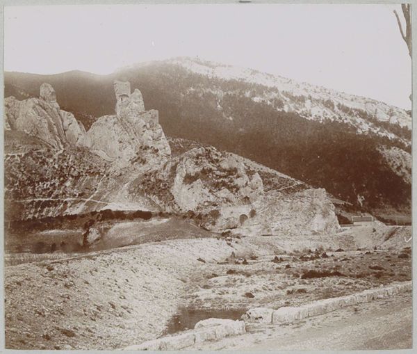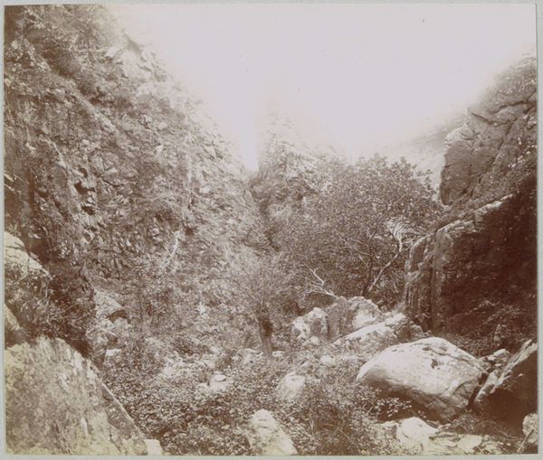 Curator: This photograph, "Tiger Shooting," was taken by Willoughby Wallace Hooper. Notice the compositional choices; the tiger is partially obscured by rocks, while the hunters are more distant and elevated. Editor: It's a bit unsettling, isn't it? The tiger, cornered and vulnerable, becomes a symbol of the power dynamics inherent in colonial encounters. Curator: Precisely. The act of hunting, often glorified, here exposes a darker narrative about control and exploitation. What's fascinating is that the sepia tone lends it an antiquated, almost romantic feel that belies the violent scene. Editor: The process of creating such an image itself is relevant. The labor required, the materials used—the photographer's very deliberate framing of the scene—all reveal the material reality of colonial power structures at play. Curator: Yes, each detail, from the tiger’s pose to the hunters' positioning, contributes to a complex web of cultural meaning. It serves as a potent reminder of the psychological and ethical implications of our interactions with the natural world. Editor: It prompts us to consider how acts of representation, like photography, can simultaneously document and perpetuate specific ideologies. Food for thought.