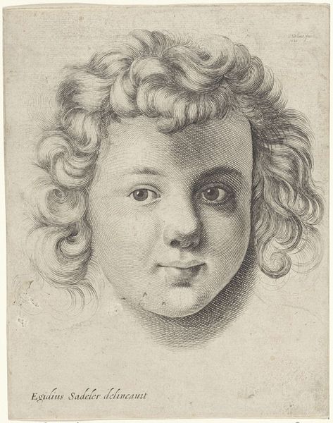 Curator: Here we have "Portret van een jongen met krullend haar" a pencil drawing by François Morellon La Cave, dating to between 1706 and 1768. It’s currently held at the Rijksmuseum. Editor: My initial thought is that this work seems rather intimate, almost as if the artist captured a candid moment. The softness of the pencil and the boy's expression create a sense of gentle curiosity. Curator: Indeed, the Baroque style, which emphasized drama and grandeur, takes on a surprisingly tender form here. Portraits, of course, served to immortalize and often to aggrandize the subject, but La Cave’s focus seems less on status and more on capturing a specific likeness, a personality. Editor: And the use of the pencil drawing, rather than say, oil on canvas, suggests a more accessible, immediate representation. Was it perhaps a study for a larger work, or a more personal project, outside formal commissions? Curator: It’s difficult to say definitively, but I lean towards the latter. The simple line framing the head creates a sense of containment, further drawing our focus to the boy’s face and playful, somewhat sly smile. This simplicity seems to speak to the artistic freedom inherent in intimate pieces. Editor: The "curly hair" in the title becomes almost a symbolic halo; an indicator of youthful innocence, almost cherubic, further augmented with these full cheeks and puckered smile, as if keeping a juicy secret. What do you think he is dreaming about? Curator: You know, in this period, portraiture was deeply intertwined with notions of identity and societal expectations. In that context, his barely-there smile could almost read as subversion or rebellion against imposed decorum, yet softened and humanized by those charming ringlets of his hair. Editor: That’s fascinating. I wonder how this image circulated. Would it have been for private family viewing only? The subtle gradations and detail seem almost too sophisticated for mere private indulgence, no? Curator: Possibly. Considering the prevalence of printed portraits, there is no doubt about the likelihood of this drawing serving as a reference, albeit for a smaller, more discerning audience. Editor: This discussion has highlighted, at least for me, the nuanced play between the intimate and formal portraiture. I never cease to be amazed at what images carry over time. Curator: It certainly offers a lovely invitation to think about not only artistic intention but also reception—how art circulates and touches people in myriad ways throughout its history.