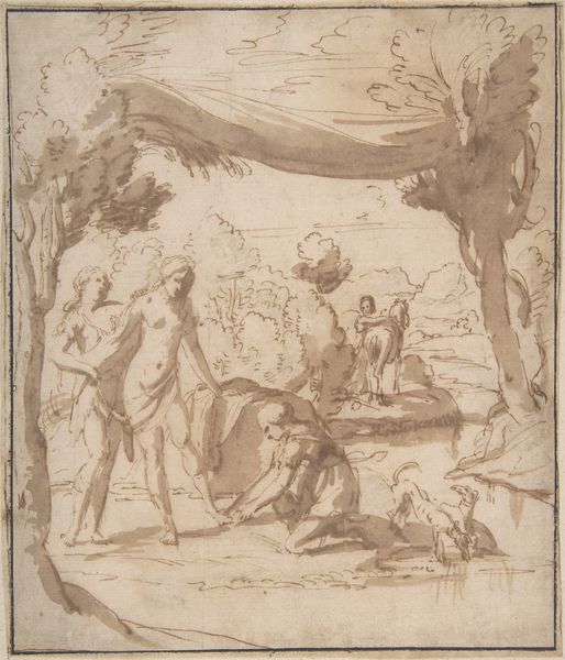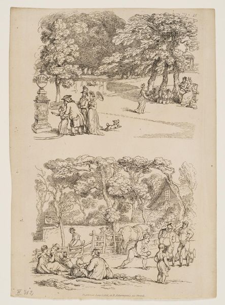 Editor: This is Thomas Rowlandson's "World in Miniature", a delicate line drawing. It's filled with different scenes, almost like a storyboard. How do you interpret the way Rowlandson presents these slices of life? Curator: This work speaks volumes about the social fabric of Rowlandson's time. Notice how each vignette seems to depict a different class, a different activity, a different power dynamic. It's almost as if he's presenting a microcosm of society. What do you make of that deliberate arrangement? Editor: I see how he contrasts leisure with labor, refinement with the mundane. Did Rowlandson intend to critique these social strata? Curator: Precisely! His satirical edge is evident. By juxtaposing these scenes, he invites us to consider the inequalities and contradictions inherent in the social order. How does this relate to contemporary issues of class and representation, do you think? Editor: It makes you think about who gets to define "normal" and whose stories get told. Thanks, I'm seeing so much more complexity now. Curator: Absolutely. Art like this encourages us to question those very power structures. It’s a small world, as Rowlandson suggests, but its inequalities loom large.