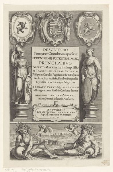 Editor: Here we have "Architectural niche with Prudence and Strength amidst angels" from 1658, by Pieter Philippe, made using engraving and ink on paper. Looking at it, the detail is so intricate; it feels very imposing. How do you interpret this piece? Curator: Oh, it speaks of an era so different from ours! The rigid order… well, on one hand, it's announcing the 'Great Placard Book', a compilation of decrees. But darling, it's not just about rules! It is a Baroque fantasy. See how the angels—the *putti*—frame it? What do they tell you? Editor: That it is grandiose and aspirational. And… slightly overwhelming. Curator: Exactly! Notice the personifications of "Prudence" and "Strength". The contrast of "Prudence" with "Strength" framing laws suggests, well, a delicate balance. Does the motto near the bottom catch your eye, or even challenge, perhaps, what is taking place here? Editor: Yes, "They mitigate discord", doesn’t quite fit with the strict image. Is it ironic? Curator: Darling, life is ironic! Art reflects it. This elaborate design isn't just decoration; it's about projecting power, perhaps even hiding the real challenges of governing. It is really not too different from what is happening now with new laws. So what is more unsettling for you to digest about all this "Order?" Editor: How very ornate it all is! And somehow that’s… strangely reassuring to see people have been coping with authority forever. Curator: Exactly! We're all just trying to make sense of our place in the world, darling, then and now, one placard – or painting - at a time!