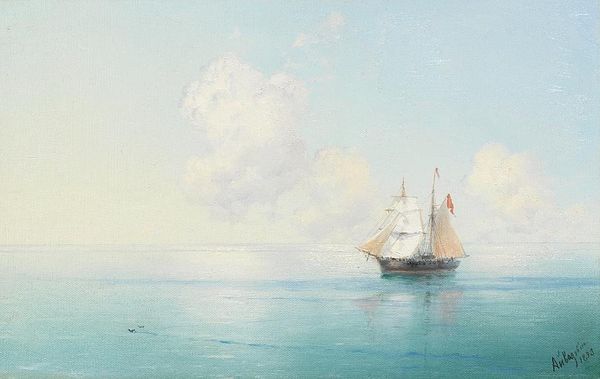 Curator: Let's delve into this tranquil seascape, "Sea view," rendered in 1899 by Ivan Konstantinovich Aivazovsky. He was a master of marine painting, deeply connected to the cultural and political significance of the sea within the Russian Empire. Editor: The atmosphere is immediately striking. There’s an almost ethereal quality to it – a luminous stillness conveyed through the blending of oil paint and the visible brushstrokes. The subtle gradations in tone...they really make you think about the materiality of light itself, reflecting on water. Curator: Aivazovsky, influenced by Romanticism and Realism, was known for his dramatic seascapes, often portraying naval battles and historical events. While seemingly serene, this piece speaks volumes about Russia’s ambition as a naval power. The ship isn’t merely a vessel, it's a symbol. Editor: I agree. I mean, the sails are furled. It is motionless, isn't it? Yet its presence commands attention, becoming almost sculptural. It emphasizes both labor and the craft— the material realities of seafaring life are apparent. One wonders how Aivazovsky approached this technically? Did he sketch at the shore and recreate this at his studio? Curator: It's suggested he relied on his memory. And indeed, memory shaped his representations of seascapes. His seascapes promoted an image of Russian strength and national identity that went beyond mere realism. His art fed a certain...nationalist fervor. Editor: Indeed, these works are carefully manufactured objects, made with distinct agendas in mind. One can certainly argue the labor involved in image-making itself deserves just as much attention, particularly when those images served political means, or bolstered a public persona. Curator: So while this work, “Sea view,” on the surface shows only the serenity of a seascape, its creation and promotion reinforced key values in late 19th century Russian society. It is history itself painted on canvas. Editor: Leaving us much to reflect upon today, on what is visible, and what lies beneath the surface in the ways images are made, and their multiple social, historical meanings.