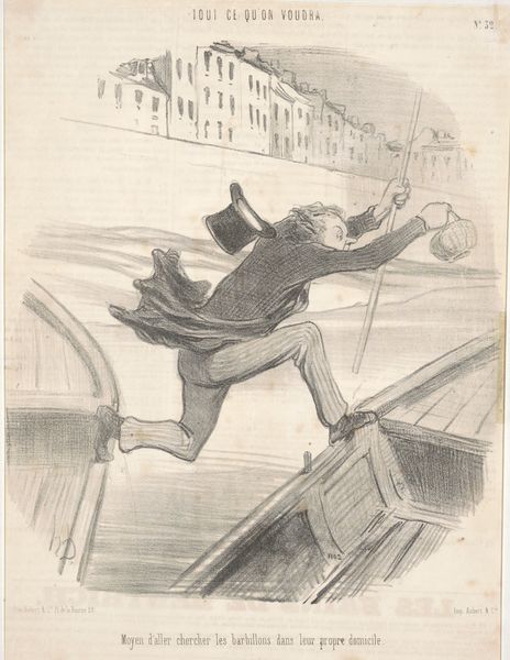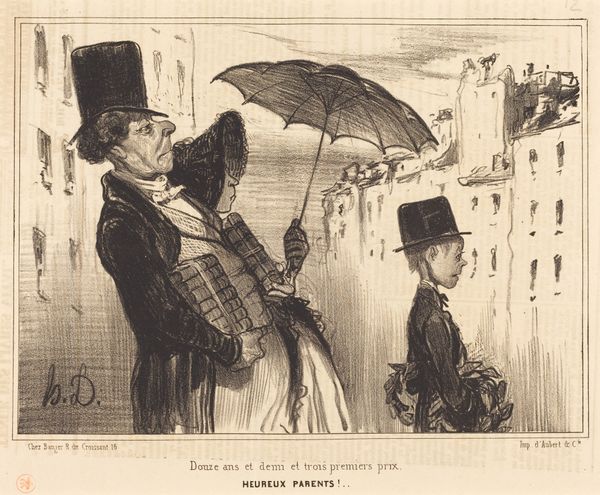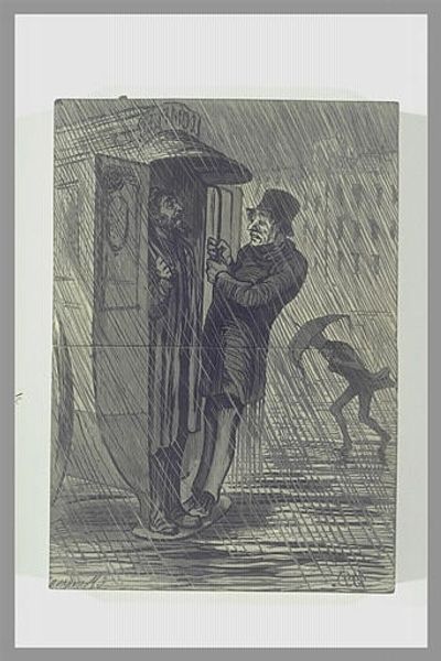 Honoré Daumier made this lithograph, "Un Monsieur au dessous de ses affaires," using a greasy crayon on a stone plate. The lithographic process is fascinating here. Daumier drew directly onto the stone, exploiting the material’s capacity to absorb both grease and water. This allowed him to create an image that could be repeatedly printed. Look closely, and you’ll see how the greasy crayon captured the texture of the falling snow and the somber mood. Daumier was deeply engaged with the social realities of his time. The print depicts a man walking past the "Mont de Piété," a pawn shop. By using lithography, a relatively inexpensive medium, Daumier could circulate these images widely, making social commentary accessible to a broad audience. The choice of this process reflects his commitment to democratizing art, challenging the traditional hierarchy between fine art and everyday life. It really makes you think about who gets to make art, who gets to see it, and what stories it tells.