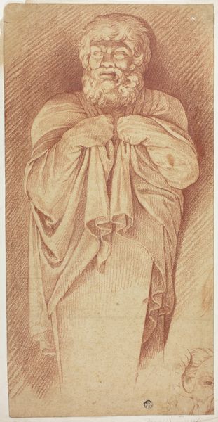 Curator: The piece before us is "Apostel Tomas" by Lambertus Suavius, an engraving created sometime between 1545 and 1548. The detail achieved in this print is remarkable for the period. Editor: My first impression is a sense of solemnity, and almost...distrust? His expression, that furrowed brow – it’s compelling. It makes me wonder, what's made him so pensive? Curator: Thomas, often known as "Doubting Thomas," carries the weight of skepticism, doesn’t he? The pointing finger can represent a gesture of authority but also serves to illustrate his doubting questions within the Gospel accounts. Notice how he holds the book, possibly Scripture, yet his gaze drifts away from it. The positioning makes me reflect on the human struggle with faith and certainty, which continues resonating across time. Editor: Yes, that gesture is key! It directs the viewer not just towards what he’s contemplating, but arguably outwards, challenging them to question too. I think placing this sort of internal struggle within a publicly reproducible medium like engraving adds another layer. It democratizes doubt, if that makes sense. Suddenly, individual faith becomes something negotiated within a community. How revolutionary! Curator: It does add complexity. Engravings like this facilitated wider dissemination of religious imagery beyond the elite. Through these portraits, religious figures were reimagined, imbued with tangible human emotions for an evolving society. This engraving bridges Renaissance artistry with nascent democratic ideals via replicated imagery and shared contemplations, which marks an exciting stage in cultural awareness. Editor: Absolutely. The accessibility of print allows for questioning and conversation in society at large, with engravings leading the charge. The image then moves out of sacred places and enters worldly life. Looking closer, notice the academic style evident in his garments and classical architecture serving as a stage, both speaking to that era's embrace of humanist thought. I love seeing the dialogue between religious imagery, humanist thinking and artmaking as the world transformed! Curator: Indeed, it captures that intersection perfectly. Seeing "Apostel Tomas," and his enduring influence, invites reflection not just upon belief, but upon the public space images occupied and continue to hold today. Editor: Beautifully said. It leaves me contemplating the enduring power of symbols, the questioning mind, and, more so, the power of art to invite everyone to ask difficult questions.
