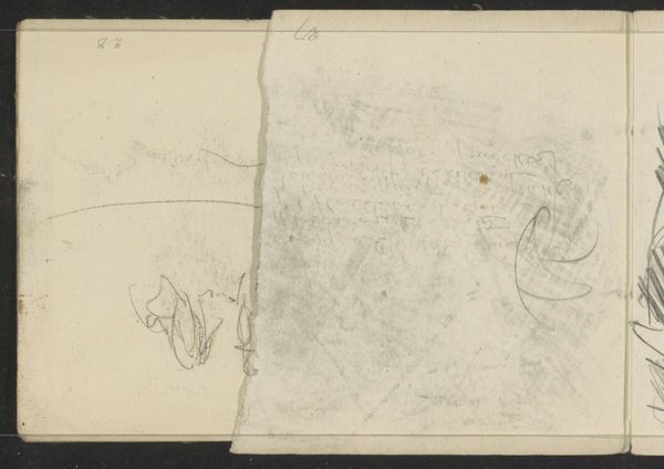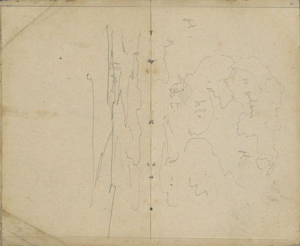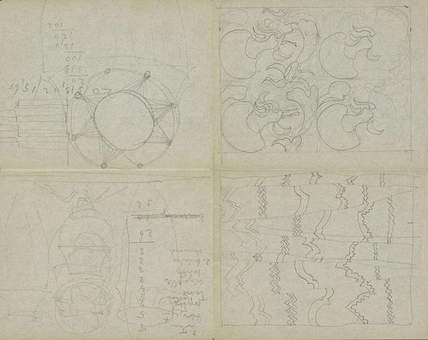 Curator: Welcome. We're standing before a pencil drawing titled "Decoratief patroon" by Carel Adolph Lion Cachet, dating back to 1896. It's held here at the Rijksmuseum. Editor: My immediate impression is that this page feels intimate, almost like catching a glimpse into the artist's private thought process. It's sketchy and raw. Curator: Exactly. This piece is very evocative of the Art Nouveau style. I find the central geometric pattern, juxtaposed with the fluid, organic shapes surrounding it, particularly compelling. It feels like an exploration of order versus chaos, perhaps reflecting the era's own anxieties. Editor: For me, the aged paper itself is fascinating. You can see the way it has toned and stained over the years, giving the whole sketch a patina of history. It really highlights the fragility and the preciousness of the material. It also looks as though Cachet worked this directly into a sketchbook. Curator: That may be the case, yes. These repeating geometric patterns within the primary form could represent protection and containment, yet the loose rendering pushes past a confining frame. The linear quality suggests a search for underlying truth, typical of Art Nouveau. Editor: Thinking about it in terms of process, I wonder if this pattern was a practice piece? We're seeing the raw work behind Cachet's practice: line, repetition, pattern as labor. Curator: Very true. I believe it goes further. Looking at the whole composition of the open page—with figures reminiscent of sea creatures almost flowing across and out of this central diamond motif, there’s almost an invitation to see symbols breaking loose from pre-ordained forms, almost longing to breach set boundary. Editor: It’s fascinating how these disparate elements come together on a single sheet of paper, a kind of visual record of an artist’s experimentations. The page serves almost as a catalog of his artistic development in that particular period. Curator: Ultimately, for me, the work speaks to a larger cultural desire for finding harmony. Editor: And for me, its value comes from observing Cachet's raw labor.