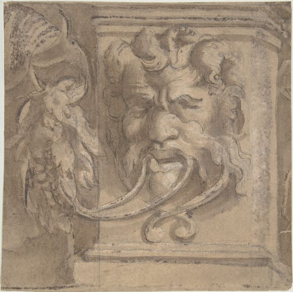 This is an anonymous drawing of a leonine grotesque head on a small sheet of paper. The grotesque, as a style, emerged from the rediscovery of ancient Roman decorations during the Renaissance. These designs often featured fantastical, hybrid creatures, blending human and animal forms. While we don't know who created this drawing, or when, the grotesque style was widely adopted in decorative arts and architecture. It offered a space to explore the boundaries of identity and the grotesque itself became a way to visualize fears, desires, and the blurring of established categories. Consider the lion: traditionally a symbol of strength and courage, but here, it’s rendered with a disturbing, almost mocking expression. What does it mean to take symbols of power and twist them into something unsettling? The grotesque invites us to confront uncomfortable aspects of ourselves and society, challenging the neat and tidy categories we often rely on.