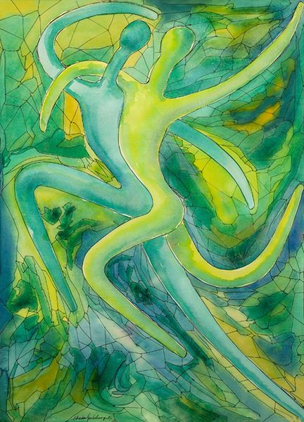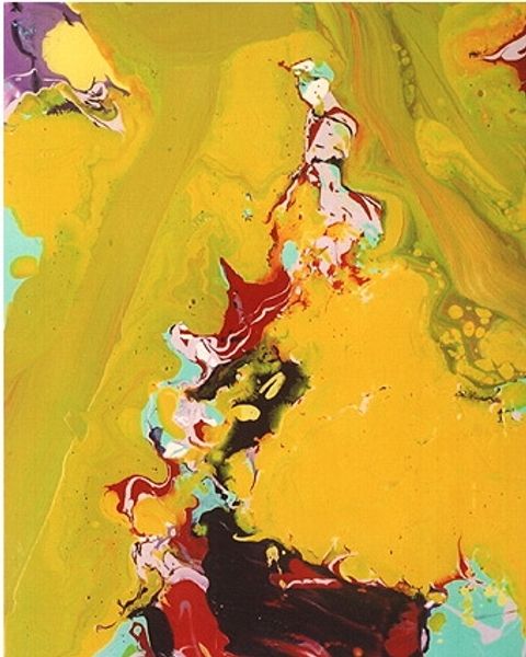 Curator: Standing before us is Georgia O'Keeffe's "Green, Yellow and Orange" from 1960. The radiant landscape is crafted using acrylic paint, a medium allowing for vibrant fields of color. Editor: The painting gives me a sudden burst of sun. The interplay between those meandering green lines and the pools of yellow is surprisingly sensual. Curator: Interesting. Considering her long fascination with the New Mexico landscape, especially its contours, can you envision a river snaking through sun-drenched mesas? Editor: Definitely, though that begs the question: is it a "river" that carries not water but… energy? It’s almost psychedelic, like a close-up of a pulsating, glowing organism. What drew O’Keeffe to acrylics, and this palette? Curator: In her later years, O'Keeffe began experimenting with this then-new synthetic medium. Acrylics would dry quickly, which made sense given her ambition to achieve precise lines. Regarding her use of color, I'm reminded of the organic farming practices she would come to value and utilize at Ghost Ranch: each shade perhaps symbolic of growth and change. Editor: Yes, and what about its accessibility? While many have centered her inspiration within Southwestern nature and transcendental realms, she seemed to embrace mass-produced goods for her ranch later in life. Considering O'Keefe adopted acrylic at a time when synthetic alternatives made waves, perhaps "Green, Yellow and Orange" gestures at modernity and new labor strategies, from canvas production to brush-stroke techniques? Curator: That's definitely a compelling viewpoint—viewing this abstraction through the lens of industry and labor! I've always felt O’Keeffe imbued her works with an inherent feeling; that despite the shifting context surrounding them, these artistic testaments to the natural world transcend rigid interpretation. Editor: And in some ways, that’s exactly what intrigues me—it seems the work lives beyond the landscape, almost as its own thing in the world.