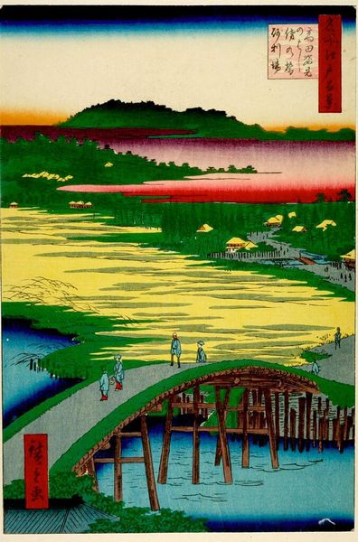 Curator: Looking at Utagawa Hiroshige's "Descending Geese at Hirakata" from his series "Eight Views of Kanazawa," there's a feeling of serene melancholy, wouldn’t you say? Editor: Absolutely. It's as though the landscape itself is breathing a sigh. But let's also consider how these idyllic scenes often masked the harsh realities faced by the working class in feudal Japan. Curator: Yes, a point well taken! I do get lost in the rhythm of the geese, their flight mirroring the graceful script above. The artist’s gentle touch just makes you forget, even if for a moment, that wider socio-political context. Editor: Exactly. By focusing solely on the aesthetic, we risk overlooking the power dynamics embedded within these portrayals of everyday life. Who had the privilege to enjoy such scenery, and who toiled to maintain it? Curator: It’s a somber thought that certainly adds another dimension to appreciating the work. Editor: Ultimately, art invites us to interrogate, not just admire. That's where its true power lies.
