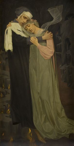 Curator: Anselm Feuerbach’s "Medea," painted in 1873, presents us with a striking depiction of the mythical sorceress. The artist employed oil paints on canvas to create this emotionally charged narrative. Editor: The first impression is overwhelming sadness and a sense of impending doom. Her bowed head and shadowed face... it’s heavy. Curator: Feuerbach uses a restricted palette – mainly earth tones with somber browns and muted golds – which amplifies the overall feeling of grief. Look at how the texture of the draped fabric contrasts with the smooth skin; what does that evoke? Editor: It points towards class divides—the opulence versus her marginalized status as a foreigner. Here she is: a woman wronged by Jason, abandoned, betrayed, reduced to this state. I also read it as the intersection of grief and anger: the heavy drapery literally weighs her down but hides her vengeful resolve. Curator: I see your point. It certainly adds layers of interpretation. The formal composition, with its strong vertical lines and the imposing classical vase beside her, creates a sense of monumentality that emphasizes her stature within this scene of despair. Her profile echoes classical statuary, emphasizing the timeless quality of the narrative. Editor: Absolutely. Her stillness contains all that potential energy. If we consider this figure within the broader narrative of women throughout history—and how societal forces confine them, or define their actions as "irrational"—"Medea" is truly a potent figure to examine. Feuerbach painted more than just a portrait. Curator: A statement on immutable truths, perhaps, of suffering and of strength? The tension he captured, the interplay of light and dark. It is quite compelling. Editor: Yes. Medea remains forever relevant, a testament to the devastating repercussions of betrayal and the enduring fight against patriarchal forces.