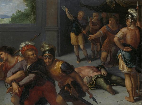 Curator: Looking at this oil painting titled "Officers Playing Tric Trac," attributed to Willem Cornelisz Duyster, what captures your eye initially? Editor: The interplay of light and shadow immediately strikes me. It's dim, almost claustrophobic, yet there's a focus on the textures of clothing and the faces of these figures gathered around the game. I'm interested in what that tabletop might be made of. Curator: Exactly. Considering its portrayal of officers engaging in leisure, it inevitably invites questions about the power structures at play within 17th-century Dutch society. Who were these men, and what privileges did their roles afford them? This work intersects with studies of masculinity and social status in the Golden Age. Editor: Indeed. The materials employed – oil on presumably wood panel or canvas, were relatively accessible, but the skill involved in rendering fabric folds and facial expressions would suggest a considerable apprenticeship. It’s the kind of labor-intensive practice that denotes a particular social class itself. What kind of materials did those clothes consist of, what are the means of textile production from this era? Curator: Thinking more deeply, I’m reminded that even depictions of recreation were rarely neutral. Consider the game itself: Tric Trac, a form of backgammon. Its presence invites considerations of competition, chance, and strategic thinking - ideas mirrored in contemporary trade and political machinations. The image subtly upholds and celebrates societal structures. Editor: That reading resonates. And observing closely, the implements they use for smoking – those clay pipes, their very fragility underlines the transient nature of wealth and pleasure. I am always interested in who the local manufacturers were, what conditions people lived in and under what economy this tableau emerged from. Curator: I completely agree; focusing on the transient allows a deeper read. The dark interior might hint at broader narratives. We see them enjoying a moment, while larger sociopolitical concerns are excluded from this small stage. Editor: Thinking about the work as a tangible thing – canvas stretched, ground pigments mixed with oils, applied laboriously by hand… these processes tell us just as much about the world that enabled the work to come into being. Curator: I like how we can both engage with this scene through various means and end at somewhat compatible places. Editor: Agreed, viewing the same work using very different sets of concerns definitely can take the spectator into some unique, challenging places.