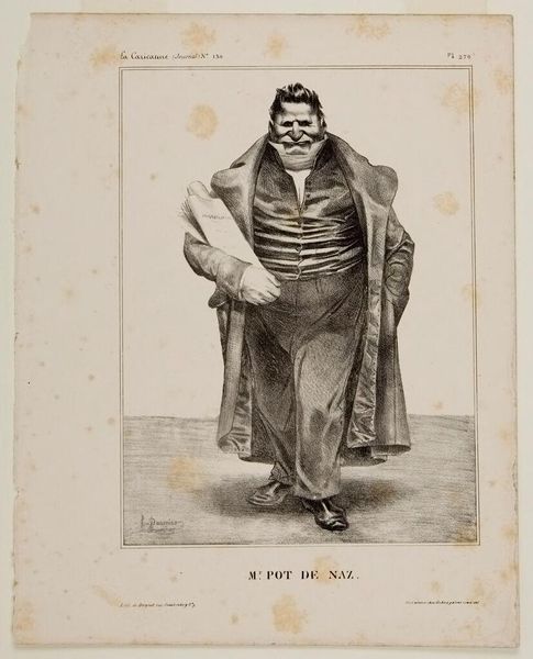 Curator: Daumier's lithograph, "Mr. Cunin Grid," presents a rather…stiff gentleman. The sharp lines and contrasts lend a certain severity. Editor: Yes, it's severe. The artist seems intent on highlighting the sitter’s discomfort within his social milieu. It reads as an indictment of bourgeois complacency. Curator: The emphasis on line certainly guides the eye. Observe how the hatching defines form, particularly the subject’s tightly buttoned waistcoat and pursed expression. It is meticulously rendered. Editor: But that meticulousness serves a purpose. Daumier was a master satirist. He weaponized these images to critique the July Monarchy's corruption and its impact on everyday people. Curator: Fair, but I appreciate the formal devices in play: the use of chiaroscuro, the balance of the composition. Editor: Indeed, yet we cannot divorce form from content. This image is but one salvo in Daumier’s long campaign for social justice. Curator: I see your point. A potent blend of aesthetics and activism, truly. Editor: Precisely, and one that resonates even now.