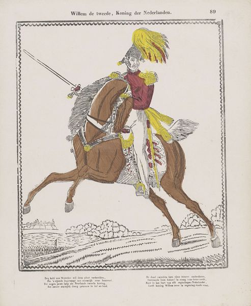 Editor: This mixed-media print, “Het hobbelpaard,” which translates to “The Rocking Horse,” created by Glenisson & Van Genechten sometime between 1833 and 1856, feels wonderfully whimsical, with its naive style and vibrant, almost pastel, color palette. How do you interpret the symbols within this piece? Curator: Immediately, I see the layers of cultural memory at play. The rocking horse itself is an enduring symbol of childhood innocence and the joy of play. But, observe how the artist has depicted the rider, dressed in what appears to be period costume. Doesn't this juxtaposition suggest more than just a simple child's toy? Perhaps, it's hinting at a nostalgic yearning for a romanticized past? Editor: That’s interesting. The clothing and the style of the horse give me the sense of theatre, a stage set where playacting is front and center. Is this about how we rehearse being adults when we are children? Curator: Precisely. It's possible this work subtly alludes to how we learn and internalize historical narratives and social roles through play. Notice the controlled colours and careful detail – even a simple toy horse contains complex signifiers and echoes. The way it has been drawn might even reflect popular theatrical forms, like pantomime, and their roots in traditions of street performance, passed down over time. Does the visual harmony and colour contribute to an overall impression for you? Editor: The symmetry of the horse and rider within the bordered frame lends the image a calm, orderly feel, a bit like a treasured scene safely framed in our memory. It makes the image feel like looking back and a longing to repeat these early moments, of learning, rehearsing and experiencing life. Curator: That’s insightful. Thank you, I’m left contemplating how art preserves not just memories, but also the evolving interpretations we place on those memories.