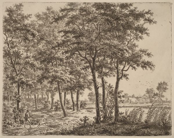 Jan Hackaert made this landscape with a stream sometime in the 17th century, using etching. This printing process involves covering a metal plate with a waxy, acid-resistant substance. The artist then scratches away the coating with a pointed tool, exposing the metal. When acid is applied, it bites into the exposed lines, creating grooves that hold ink. Hackaert clearly revels in the linear quality of the etching process. Look at how he renders the densely packed leaves. He uses short, quick strokes that mimic the foliage's texture. The varying thickness of the lines gives depth and shadow, creating a sense of volume despite the limited tonal range of a black and white print. As a multiple, the print is unlike a painting or drawing. It is inherently repeatable and belongs to an economy of image distribution. So while the subject might be the calm of nature, the very nature of the artwork evokes a complex world of circulation and exchange. Understanding the materials, and the making, allows us to see its broader cultural context.