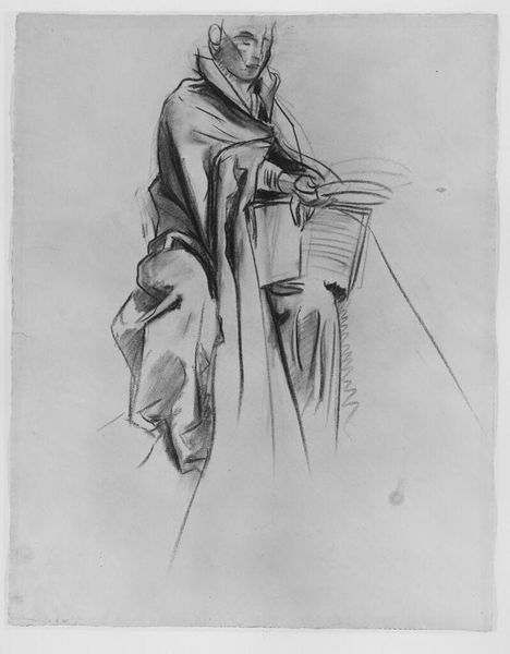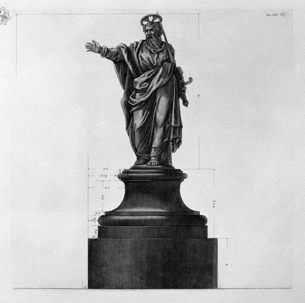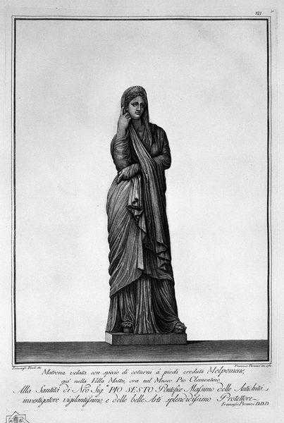 Editor: This print is called "The burial statue" by Giovanni Battista Piranesi. The image depicts a rather serious figure, draped in cloth and leaning thoughtfully on a funerary marker. There's a lot of intricate detail in the engraving. How do you interpret this work, especially considering Piranesi’s other engravings? Curator: Indeed. Looking closely, we can consider how Piranesi uses line to delineate form and texture. Notice how the hatching varies in density to create a sense of volume and shadow. This emphasizes the weight and monumentality of the statue, wouldn't you agree? It's also crucial to recognize how the formal composition leads the eye, from the inscriptions to the face of the depicted figure. Editor: I see what you mean. The way the light falls really emphasizes the drapery. What about the figure’s posture; what does it evoke for you? Curator: Precisely, his pensive pose, with his finger to his chin, immediately draws attention. Semiotically, it references the philosophical ideal rooted in antiquity, whilst also conveying that idea of memory and reflection pertinent to funerary art. It merges the physical materiality of the engraved statue with the idea it portrays, namely mortality and remembrance. Editor: That’s fascinating. I hadn't considered how deeply embedded classicism is here. I see that Piranesi balances pure representation of form and evokes a deeper contemplation about the theme and topic. Curator: Exactly. The genius of Piranesi, evident through his engraving, is how he invites viewers to engage both with the artwork’s structure, and ponder mortality, a common subject during the Romanesque era. What a master! Editor: Yes, seeing how line and form come together to create something greater helps me to appreciate it so much more.