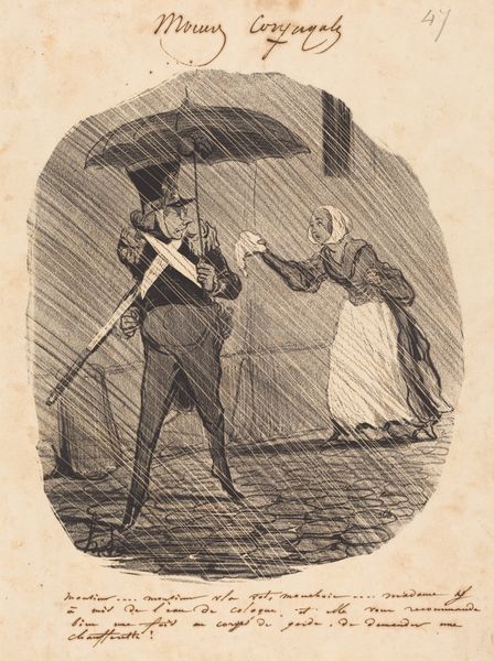 Honoré Daumier created this lithograph titled “Monsieur, Monsieur, here's your handkerchief. Madame has put some Eau de Cologne on it and she said you should ask at the Guard whether you might get a foot warmer,” in 19th-century France. Daumier made a name for himself through social satire, holding a mirror up to the bourgeoisie. Here, the artist captures a seemingly mundane moment. A woman, presumably a wife, rushes out into the rain to deliver a handkerchief to her husband, a member of the National Guard. Yet, Daumier elevates this interaction into a commentary on gender roles and class expectations. The husband, burdened by his military obligations, strides forward, seemingly unfazed by his wife's concern. She, in turn, embodies the dutiful and caring spouse, braving the elements to ensure his comfort. The rain, rendered with frantic lines, mirrors the anxieties and pressures of bourgeois life. The story is a bittersweet reflection on the ties that bind, and the subtle power dynamics that simmer beneath the surface of daily life.